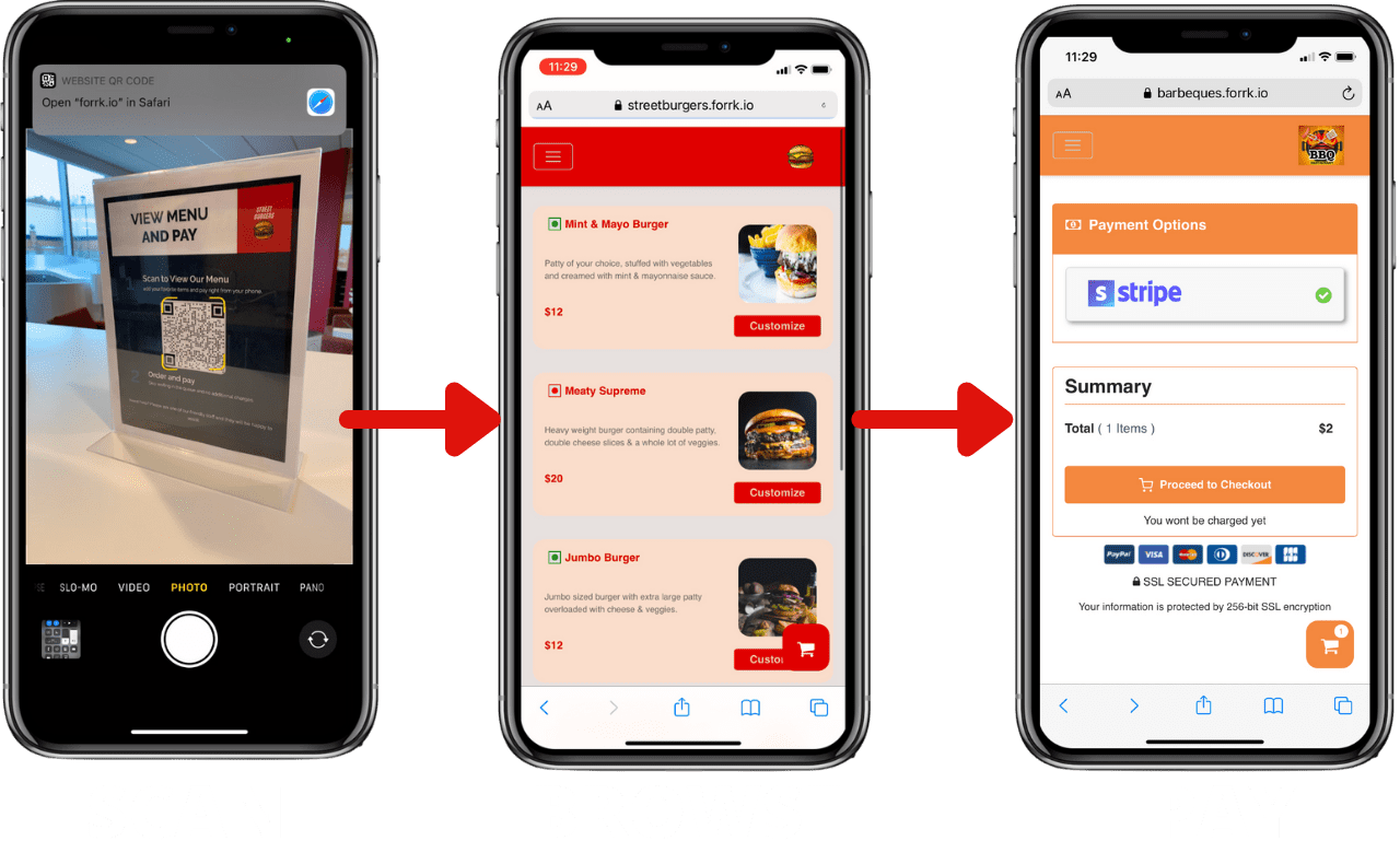 Then, customize, print-out, or embed a QR-code touchless menu that goes to a mobile ordering system for the restaurant client. When scanned, the QR-code will load the restaurant’s menu for their customers to view and order from on their phone whether in the restaurant or from home.